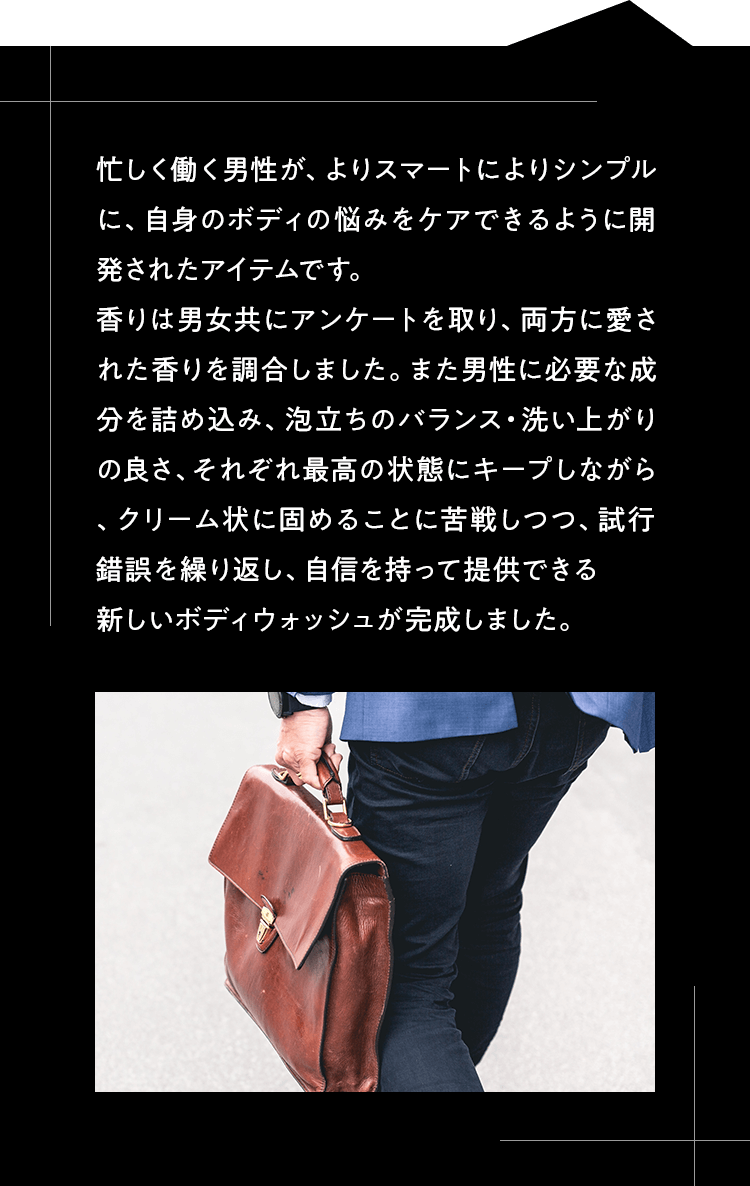 ニオイの原因は大きくわけて、汗と皮脂の2つ。皮脂は肌を守ってくれる大事な役割を果たしますが、乾燥するとそれが過剰になり、ニオイの原因になることも。 そこで、乾燥を防ぐためにアミノ酸保湿成分のグリシンと、コメ発酵液・ホップエキスなどの保湿成分を9種配合、洗い上りはスッキリなのにしっとりとうるおう使用感を追い求めました。